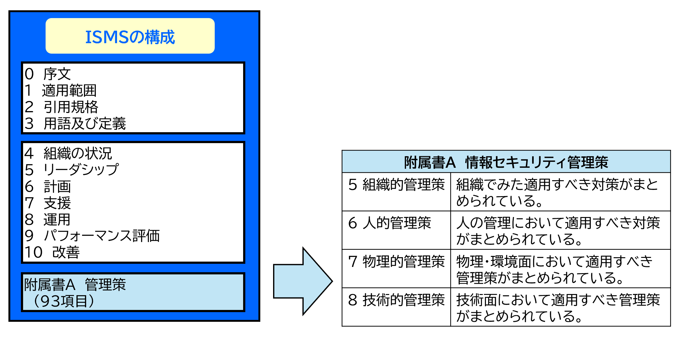 ホーム ISO認証メニュー ISO/IEC 27001 ISO/IEC 27001 情報セキュリティマネジメントシステム 規格の概要 ISO/IEC 27001とは、企業や組織が自身の情報セキュリティを確保・維持するための仕組み(情報セキュリティマネジメントシステム ※以下、ISMSと言う)を確立、導入、運用、監視、レビュー、維持及び改善するためのモデルを提供するために作成された国際規格です。 規格要求事項の構成 認証条件としては、第4章から第10章までの規格本文と附属書Aの管理策の要求事項への適合が必須です。 なお、附属書Aの個々の詳細管理策は、正当な理由を適用宣言書に記述することにより除外が可能です。 認証取得から得られるメリット 社員のレベルアップ: 現代社会において必須な情報セキュリティの常識を社員が身に着けることができます。 自社のリスク管理: 拡大する情報セキュリティの脅威から、自社の情報資産、顧客の情報資産を守り、経営のリスク管理に大きく貢献します。 信頼の獲得: 顧客から、社会からの信頼を獲得し、ビジネスの遂行の円滑化、さらにはビジネスの拡大のための基礎となります。 以上の活動を継続することによりセキュリティ意識の向上、事業競争力の強化につながります。また、大手企業、官公庁等の入札条件満たすことが可能になります。 審査認証の流れ・維持 よくある質問